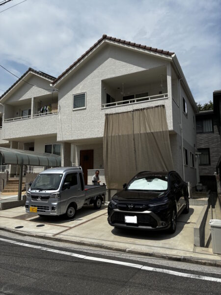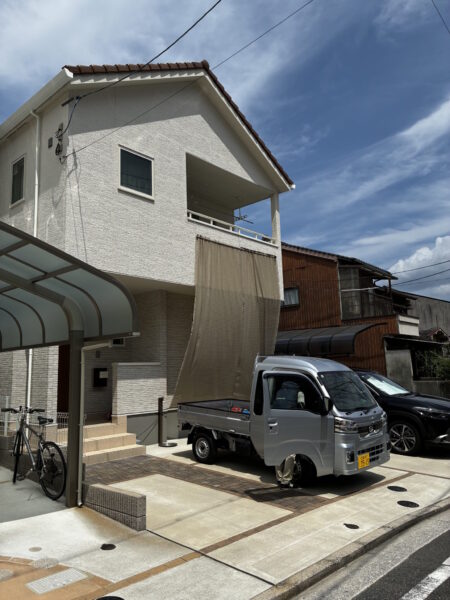 3台分は十分止めれる駐車場です。日差しがきつく、遮光ネットでリビングの窓を覆っています。