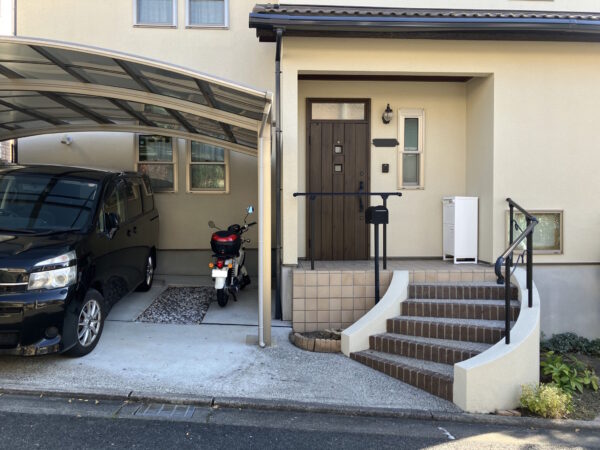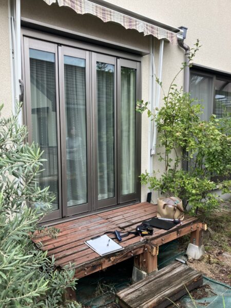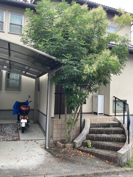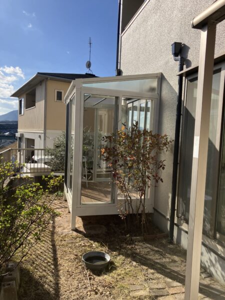 元々、付いていたオーニングがボロボロになり併せて木製のウッドデッキも朽ちてしまったのでサンルームを設置したいとの事でした。ついでに玄関のシマトネリコも巨大化したので何とかして欲しいとの事でした。