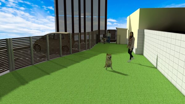 駐車場の半分を横板フェンスで囲い、中に人工芝を張り、動物病院専用のドッグランにします🐶🐶🐶