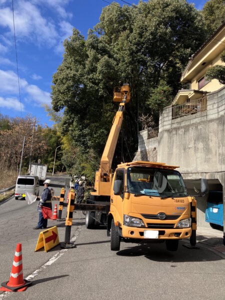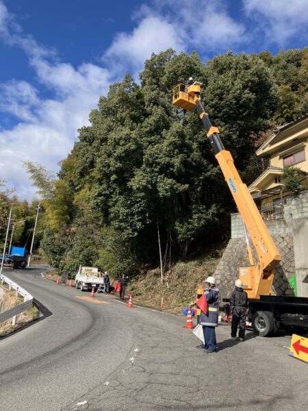 道路は片側交互通行を行い高所作業車を据えて安全に伐採作業を開始いたしました。