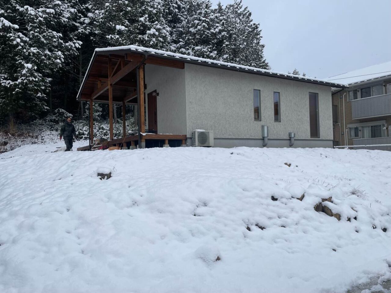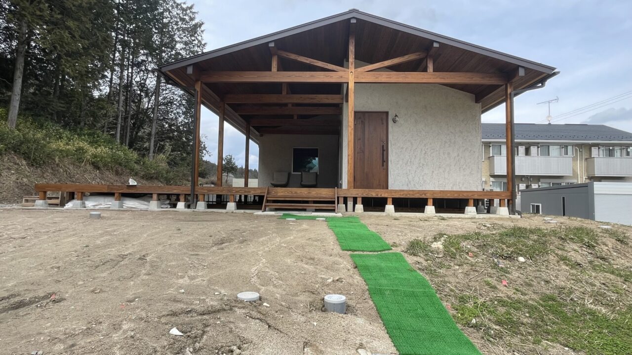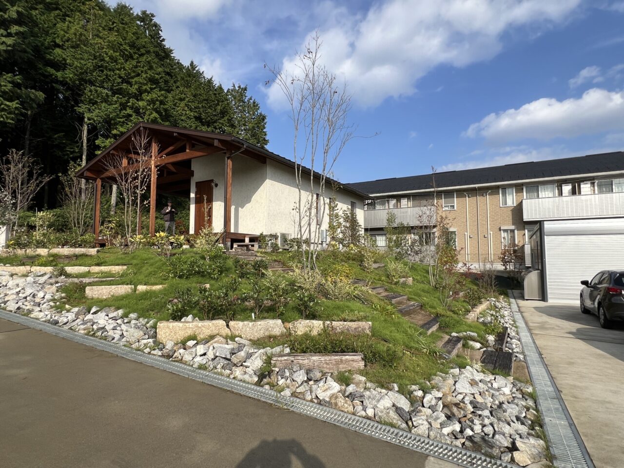 ゲストハウス南東側です。しっかり雪が積もる地域なので、雪が降っても管理のしやすいお庭を提案しました。