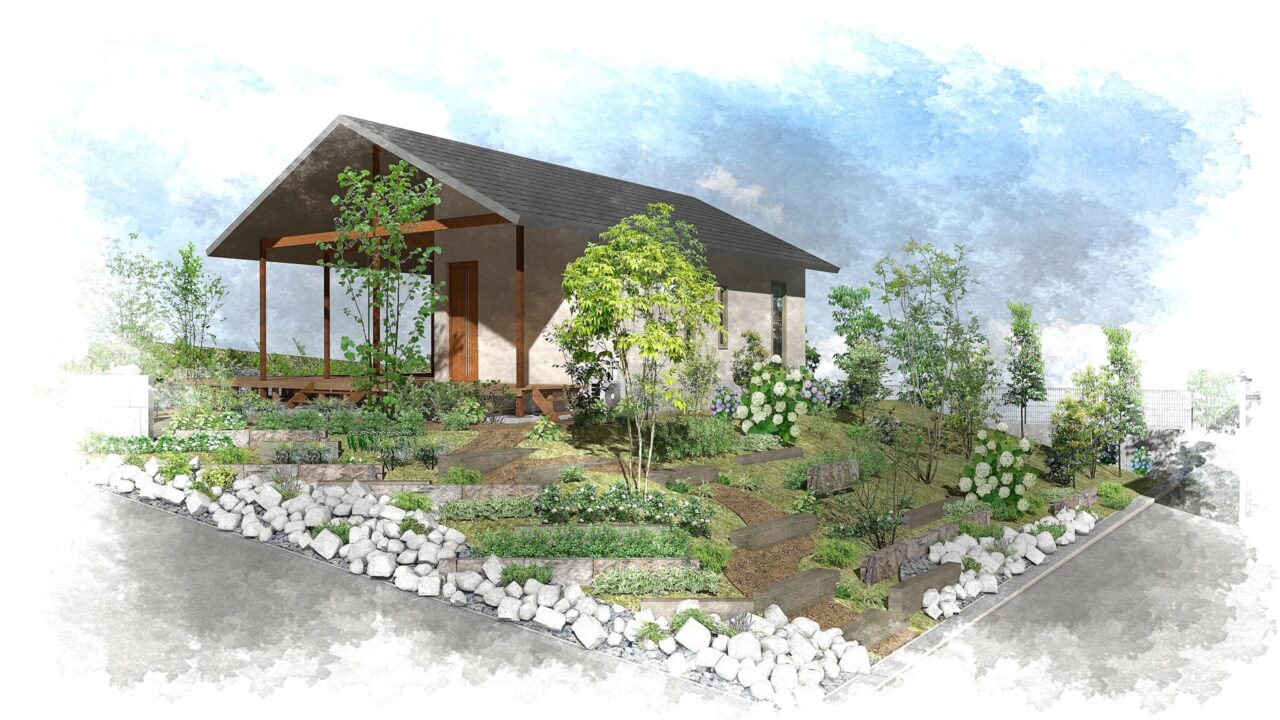 ナチュラル志向の奥様と打合せを重ね、枕木や石材等の自然素材を使用したシンプルなお庭をご提案させていただきました。