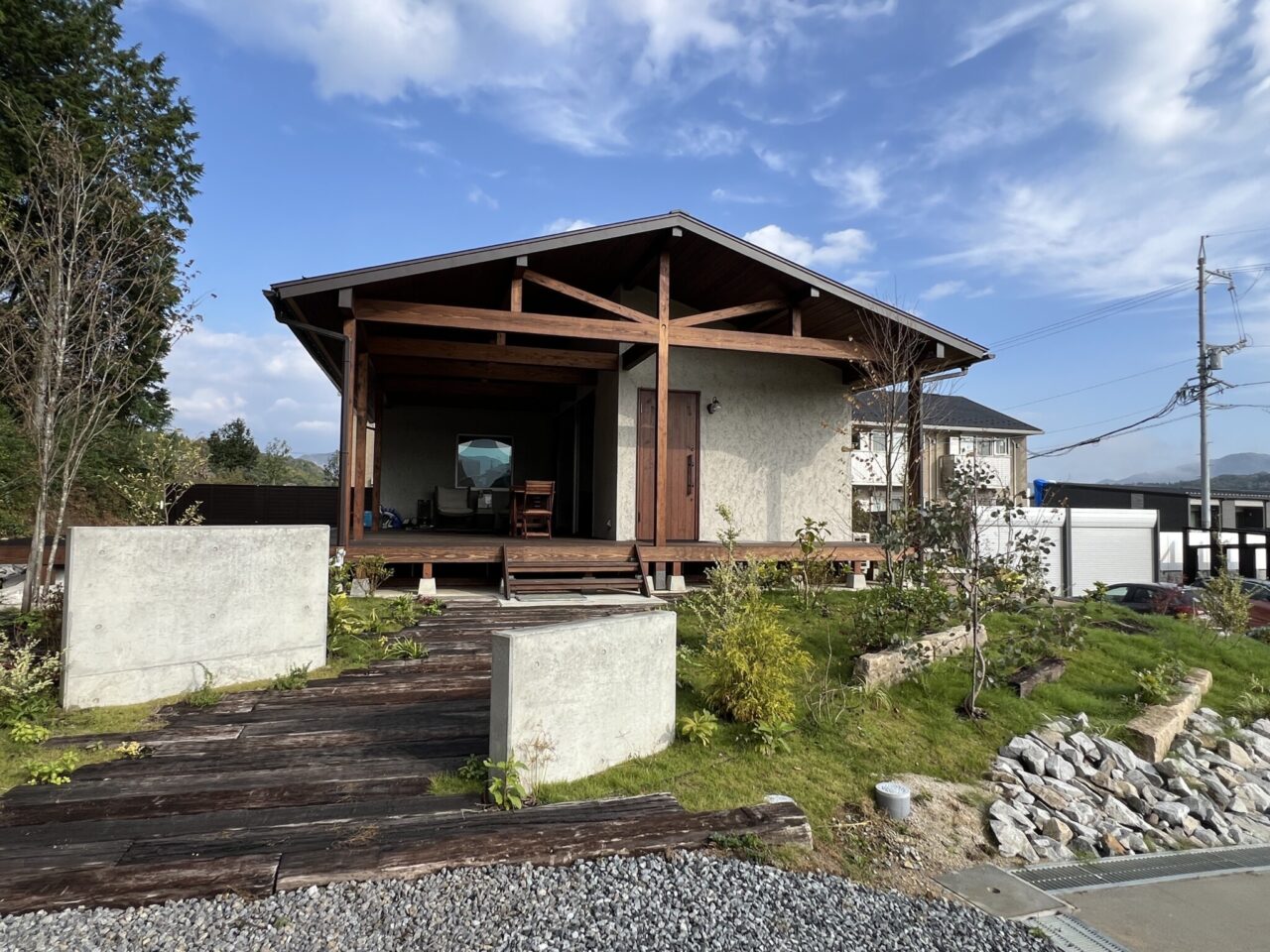 奥様ご希望の枕木でアプローチを造作しました。