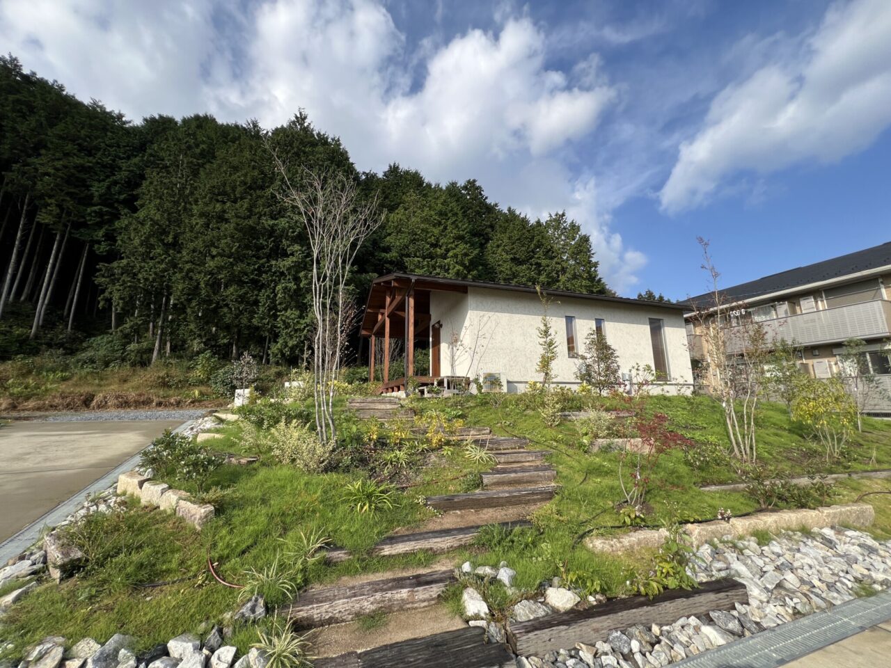 こちらも枕木で階段を造作、常緑樹や灌木類で緑の美しいお庭になっています。